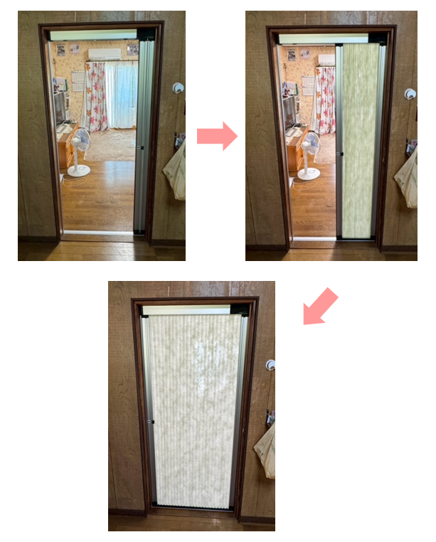 ドアのあった場所に部屋の仕切りとしてプリーツスクリーンを施工させて頂きました。