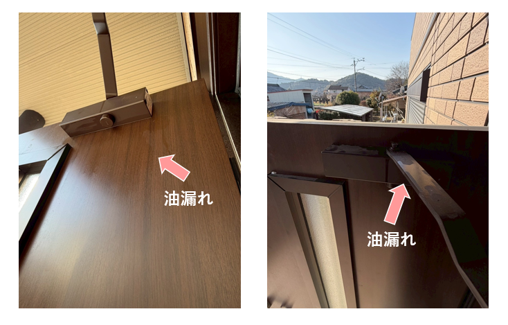 油漏れは寿命によるもので交換が必要です!油がもれてしまうとバタンとドアが急に閉まってしまうので危ないです💦1時間程で施工完了です👌