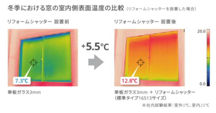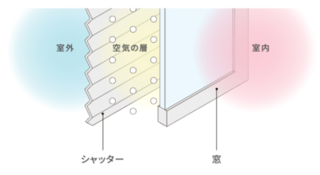 シャッターを閉める事で直射日光を遮り、室内温度の上昇を抑えます。また、窓との間の空気層が断熱効果を生み出し熱の流出を抑制します。