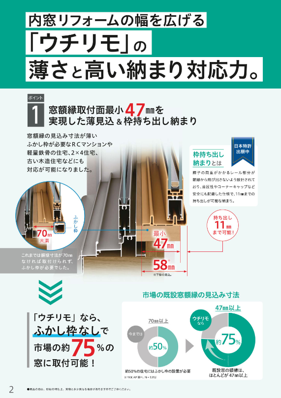 ①内窓を設置する際、窓枠の奥行が最低でも70㎜以上必要でしたがこのウチリモは47㎜以上あればOK!