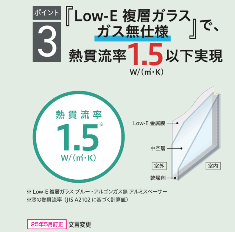 ③LOW-E複層ガラスガス無仕様で熱貫流率1.5以下実現